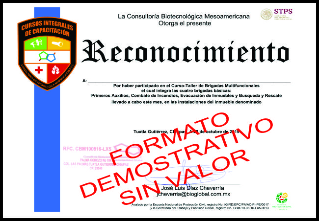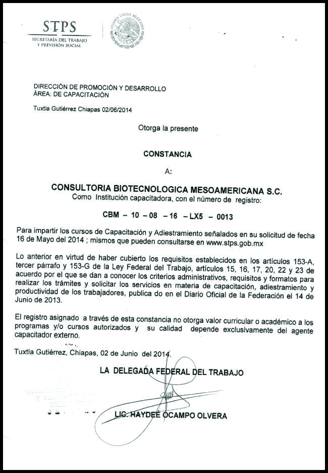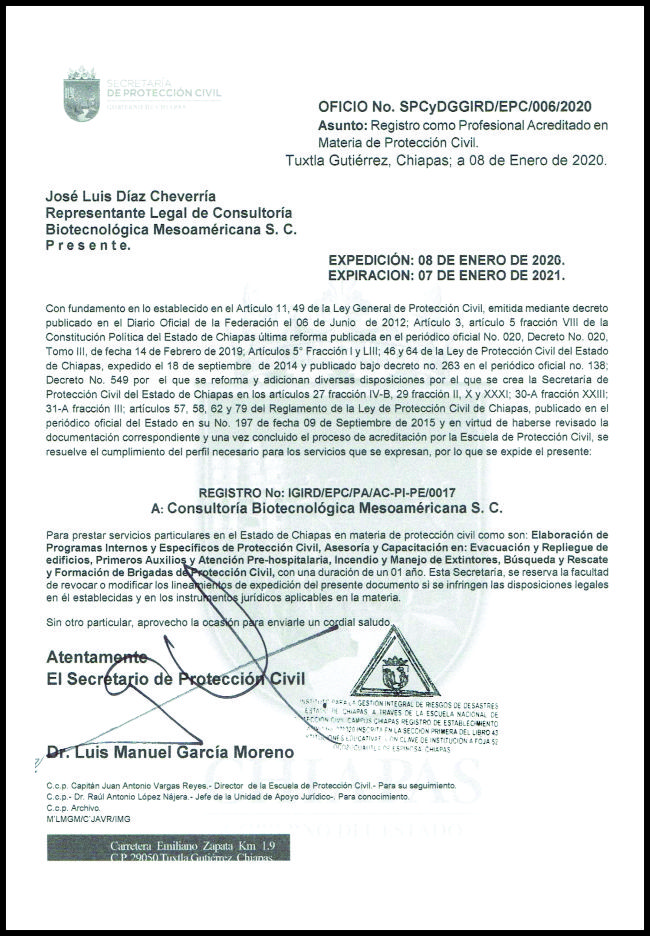 La Consultoría Biotecnológica Mesoamericana S. C. cuenta con la capacitación y cursos otorgados por la Secretaría de Protección Civil del Estado de Chiapas. El documento que vemos aqui corresponde a uno de los dos otorgados por esta honorable secretaría para poder dar los Cursos de Protección Civil a las empresas que así lo requieran.